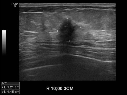 상기환자 유측유방의 멍울로 내원하신 60대 여성분으로 본원 초음파상 우측 10시 방향에서 3 cm 떨어진 거리의 멍울 조직검사 시행하여 우측 침윤성 유관암 진단 되었습니다.