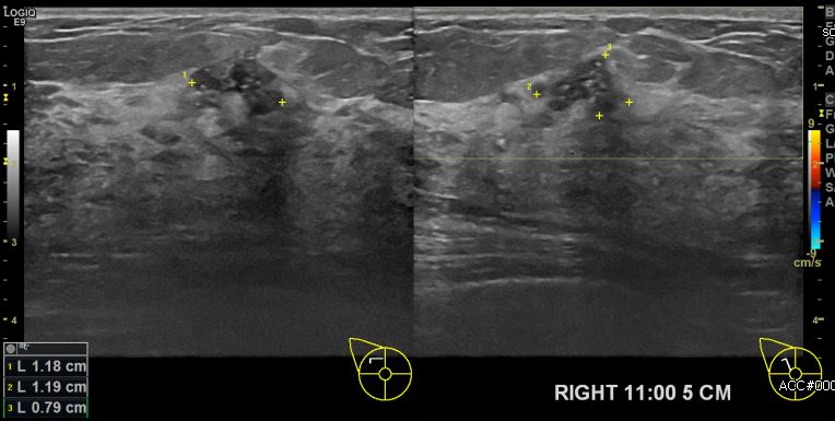 상기환자 우측유방의 멍울로 내원하신 40대 여성분으로 본원 초음파상 우측 11시 방향