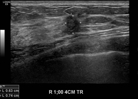 상기환자 건강검진상 이상소견으로 내원하신 40대 여성분으로 본원 초음파상 우측 1시방향에서 4cm 떨어진 거리의 의심스러운 멍울 조직검사 시행하여 우측 침윤성 유관암 진단되었습니다.