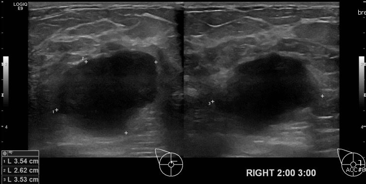 상기환자 유측 유방에 만져지는 멍울로 내원하신 50대 여성분으로 우측 2시에서