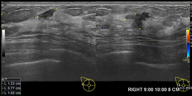 상기환자 양측 유방의 멍울로 내원하신 50대 여성분으로 본원 초음파상 우측 9시에서
