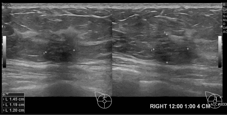 상기환자 건강검진상 이상소견으로 내원하신 40대 여성분으로 우측유방 12시에서 1시 방향에서 4cm 떨어진 거리의 의심스러운 멍울 조직검사 시행하여 우측 침윤성 유관암 진단 되었습니다.
