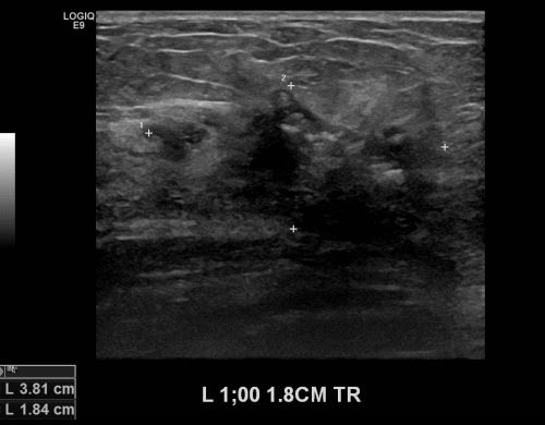 1시 방향에서 1.8cm 떨어진 거리의 의심스러운 멍울 조직검사 시행하여 좌측 침윤성