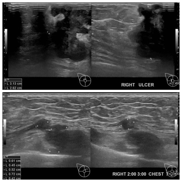 우측 2시에서 3시방향에 의심스러운 멍울 조직검사 시행하여 각각 우측 침윤성 유관암