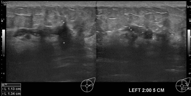 좌측유방의 멍울로 내원하신 30대 여성분으로 본원 초음파상 좌측 2시 방향에 5cm