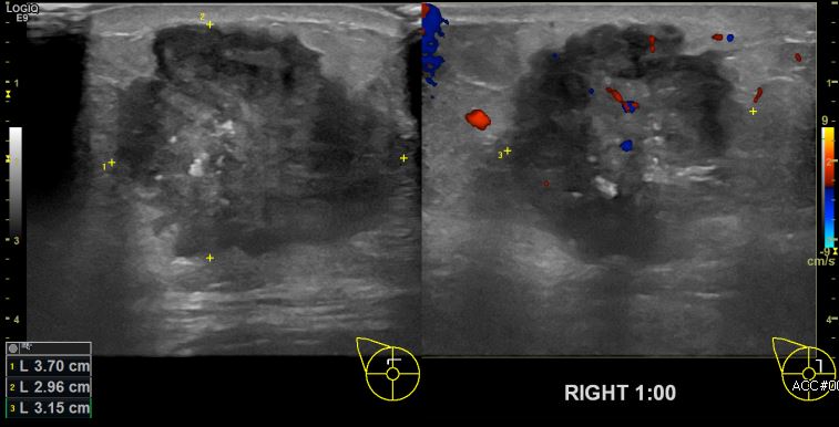 상기환자 우측 유방의 멍울로 내원하신 60대 여성분으로 본원초음파상 우측 1시 방향에