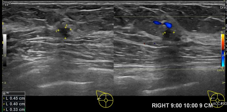 유방에 멍울과 통증으로 내원하신 30대 여성분으로 우측 9시에서 10시 방향에서 9cm 떨어진 거리의 으심스러운 멍울 조직검사 시행하여 우측 침윤성 유관암 진단되었습니다.