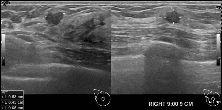 우측 유방의 멍울로 내원하신 40대 여성분으로 본원 초음파상 우측 9시 방향에