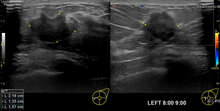 상기환자 건강검진상 이상소견으로 내원하신 50대 여성분으로 본원 초음파상 좌측 8시에서 9시 방향에 의심스러운 멍울 조직검사 시행하여 좌측 침윤성 유관암 진단되었습니다.