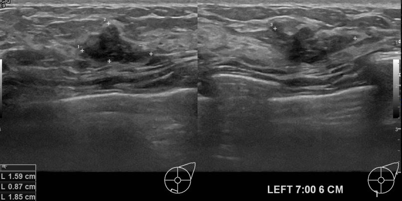 상기환자 왼쪽가슴의 딱딱해지는 멍울있어 내원하신 30대 여성분으로 초음파검사후 의심스러운 혹 조직검사진행해 유방암 진단되었읍니다.