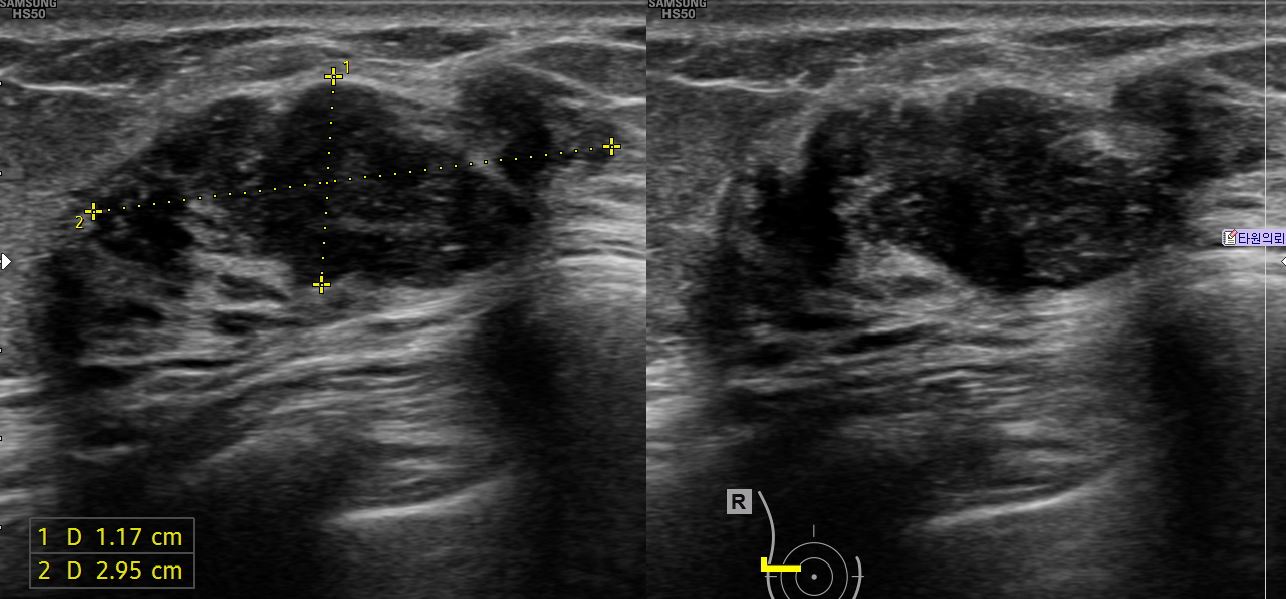 상기 환자 외부검사상 이상소견으로 내원하신 60대 여성으로 우측에 의심스러운혹있어 조직검사 시행후 유방암 진단되었습니다.