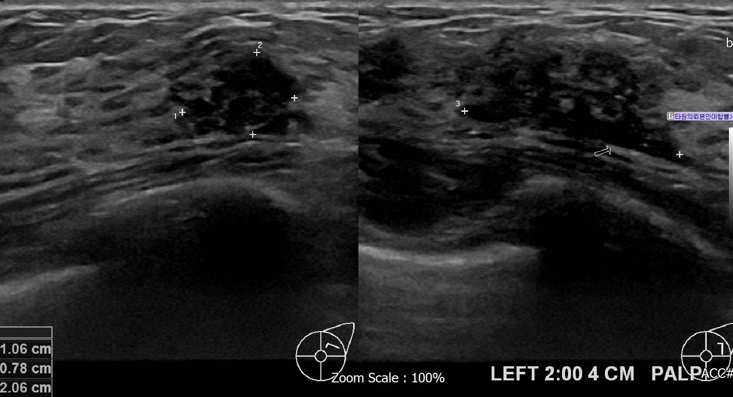 상기 환자 본원에서 경과관찰중인 40대 여성으로 좌측에 의심스러운혹있어 조직검사 시행후 유방암 진단되었습니다.