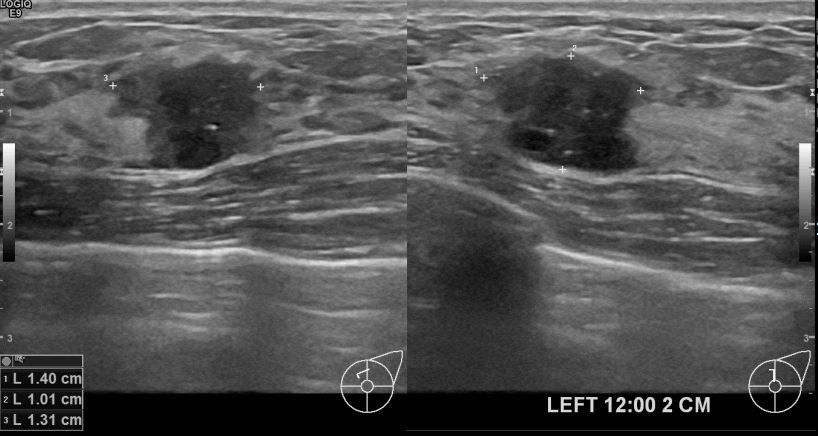 상기환자 외부검사상 이상소견으로 내원하신 40대여성으로 좌측유방의 의심스러혹