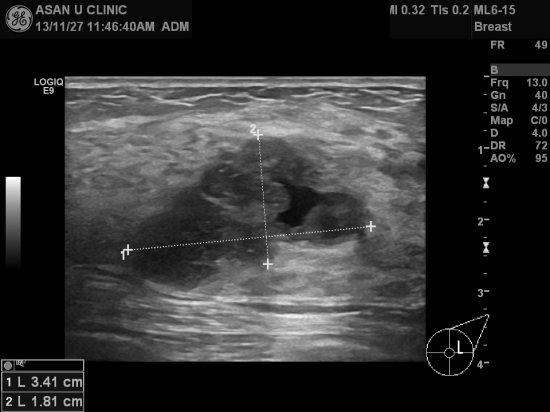 본원 초음파 검사상 좌측유방에 3.41cm의 결절과 1.32cm의 결절이 있었고