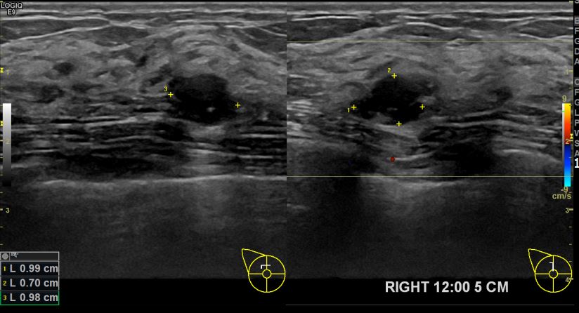 상기환자 우측 12시방향 3개월 경과관찰하신 50대 여성분으로 크기가 자라나 조직검사시행후 유방암진단되었습니다.