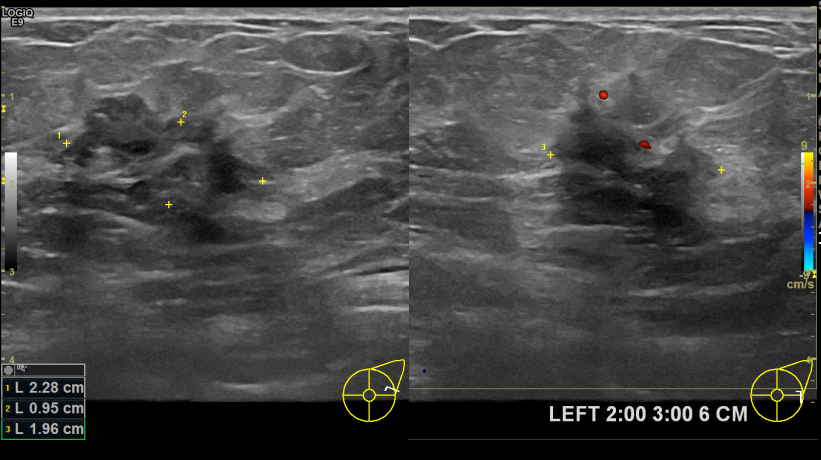 상기환자 외부검진상 이상소견으로 조직검사권유받고 내원하신 50대 여성분으로 좌측유방멍울 조직검사 시행 후 유방암 진단되었습니다.