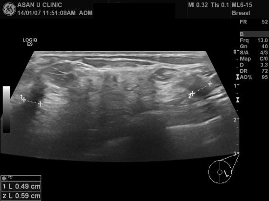 겨드랑이에는 림프절의 비대소견 없어 세침검사를 하지 않았읍니다.